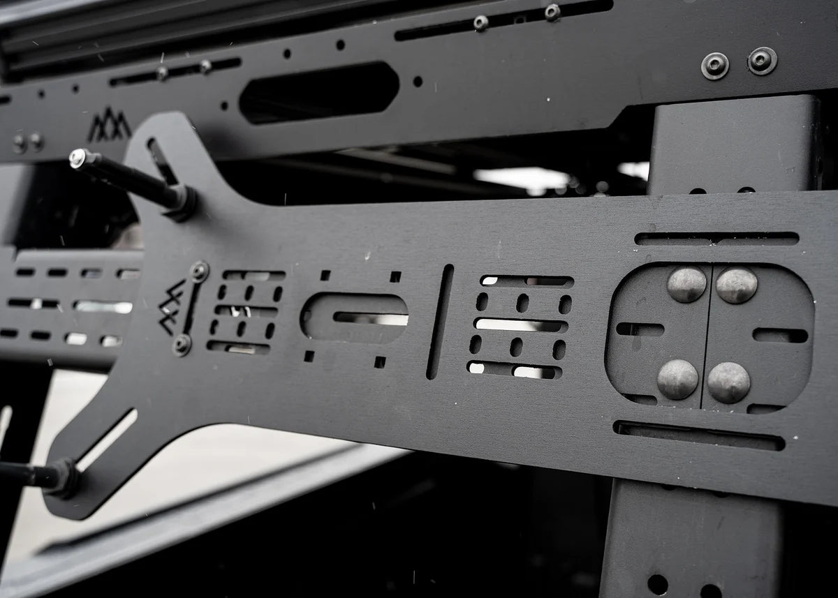 Overview: The "Dogbone" Traction Board Mount is an all aluminum panel that allows you to easily carry your traction boards, Rotopax, or other gear on any roof rack or flat surface. We have special cutouts that accept Maxtrax mounting pins and other similar traction board mounts. We also have matching cutouts to the Rotopax mounts, allowing a no drill solution to carrying extra fuel/water.