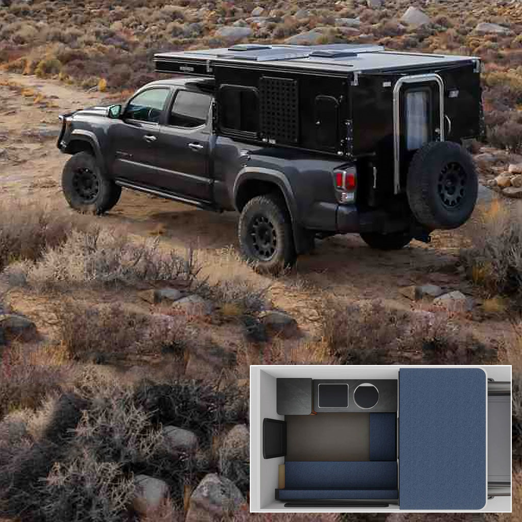 Overview: Check out this stock unit FLEET slide-in pop up Camper with Rollover Couch Floor Plan floor plan by Four Wheel Campers that will be ready for installation at any three of our locations. The FLEET model camper is made to fit most mid-size trucks with a 6'-6'7" bed length.