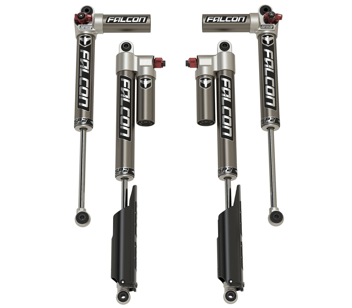 Falcon SP2 3.3 Fast Adjust Piggyback Shocks offer a wide range of adjustability with their easy-to-use 3-position Fast Adjust Knob. Settings include Soft Custom and Firm. The Custom setting incorporates an 8-Position Dial for more precise tuning. High-Value Performance" is the driving force behind our vehicle-specific dampers for Jeeps trucks and SUVs. These Jeep-specific shock absorbers deliver increased stability improved ride quality and comfort for daily-driven vehicles as well as race-inspired performance handling and stability for off-road rigs. Falcon Performance Shocks by TeraFlex. SP2 3.3 Fast Adjust Piggyback Shocks: • SP2 3.3 Fast Adjust Piggyback Shocks offer a wide range of adjustability for specific terrain and/or handling characteristics • Fast Adjust Knob w/ 3 compression settings for large damping adjustments • Settings include: Soft Medium Firm • Custom setting includes an 8-Position Dial for finer damping adjustments • SP2 Mode Adjust tunes compression and rebound for Soft or Performance settings • Ideal for daily-driven Jeeps as well as the serious enthusiast wanting to adjust damping for all driving conditions JL Falcon Shocks: • JL corner-specific shock absorber w/ race-inspired performance • Front lower offset eyelet design provides maximum shock body to frame clearance during articulation • Rear roost guards prevent shock shaft damage from rocks kicked up by the tires • SP2 Mode Adjust tunes compression and rebound for Soft or Performance settings Falcon Series 3 Piggyback Shocks: • Piggyback design increases oil and gas capacity for reduced heat • Flows 6x more oil than restrictive reservoir hose designs • Eliminates common leakage issues found in banjo and swivel fittings • Front shocks– unique horizontal piggyback reservoir increases tire clearance • Cartridge Upgrade Kits are available separately – contact customer service for details