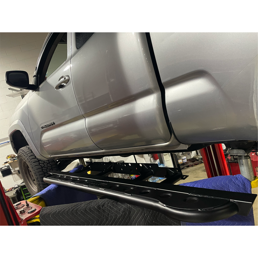 Overview: The Main Line Overland design works has come up with our latest piece of gear for getting off the beaten path: MLO Rock Sliders. Featuring beefy DOM steel tubing, rear kick-outs, welded top plates, and available in either raw steel or satin black powdercoat, these bolt-on sliders are perfect for 2nd & 3rd Gen, 2005-2023 Toyota Tacoma.