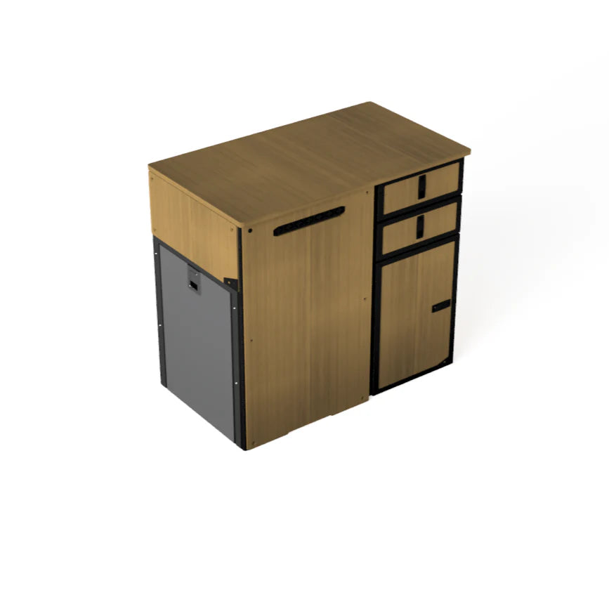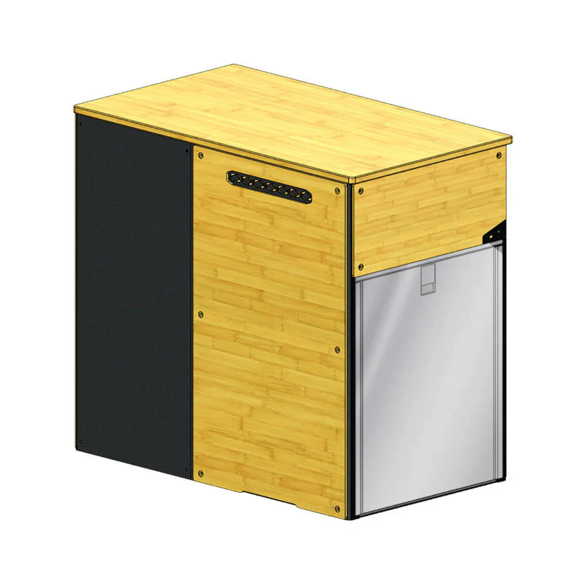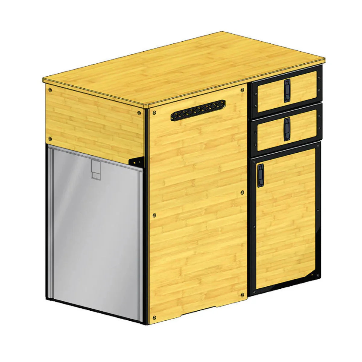 Overview: The Grub Galley is the most modular galley on the market and has almost endless configurations. Whether you want your fridge to face forward on the passenger side, the driver side, or some other configuration, the Grub Galley has you covered. The Grub Galley is a combination of our Grub Fridge Cab and our Grub Drawer Cab. Both units are made from laser-cut and CNC-bent lightweight aluminum frames clad in bamboo panels or laminate. Pair the Grub Galley with any of the Grub Family accessories to build your ideal setup.