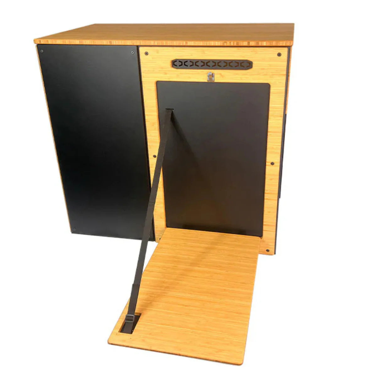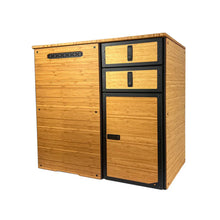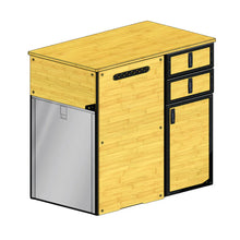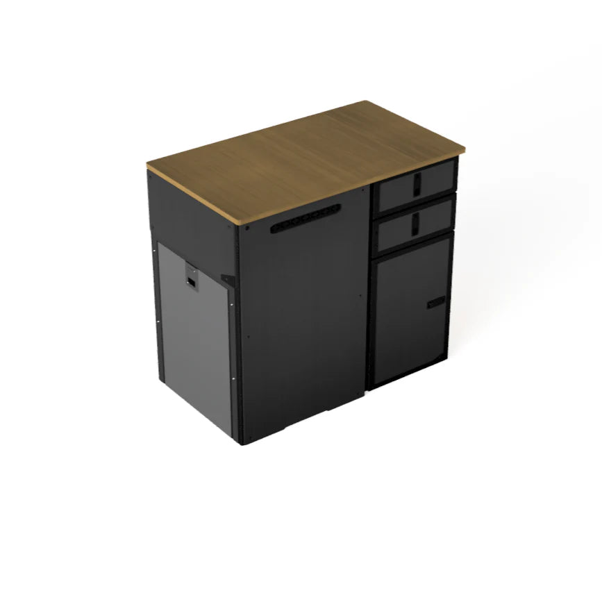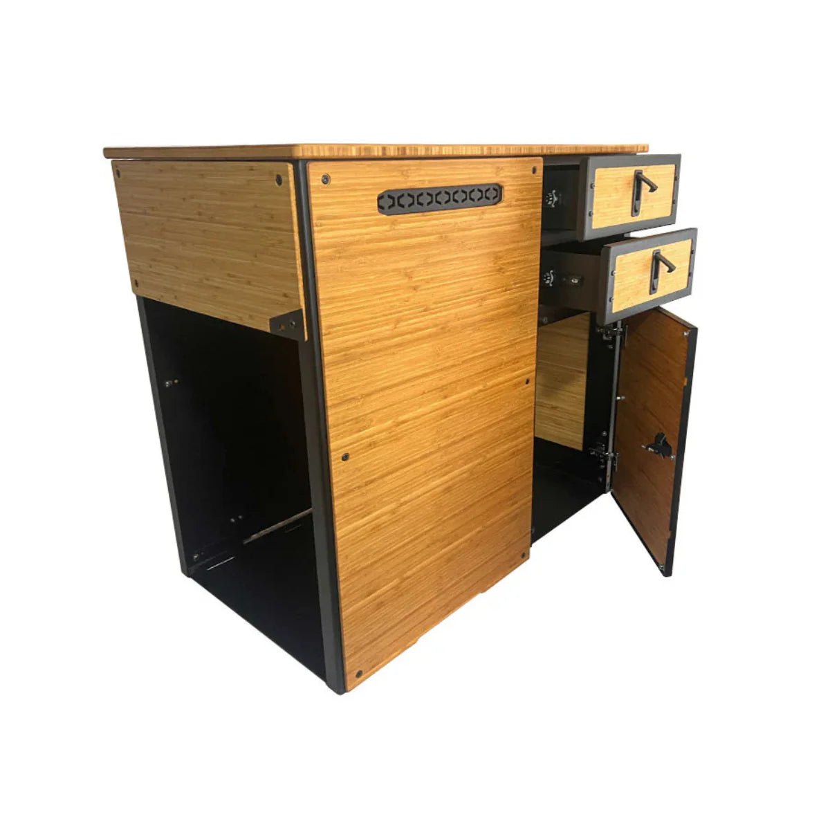 Overview: The Grub Galley is the most modular galley on the market and has almost endless configurations. Whether you want your fridge to face forward on the passenger side, the driver side, or some other configuration, the Grub Galley has you covered. The Grub Galley is a combination of our Grub Fridge Cab and our Grub Drawer Cab. Both units are made from laser-cut and CNC-bent lightweight aluminum frames clad in bamboo panels or laminate. Pair the Grub Galley with any of the Grub Family accessories to build your ideal setup.