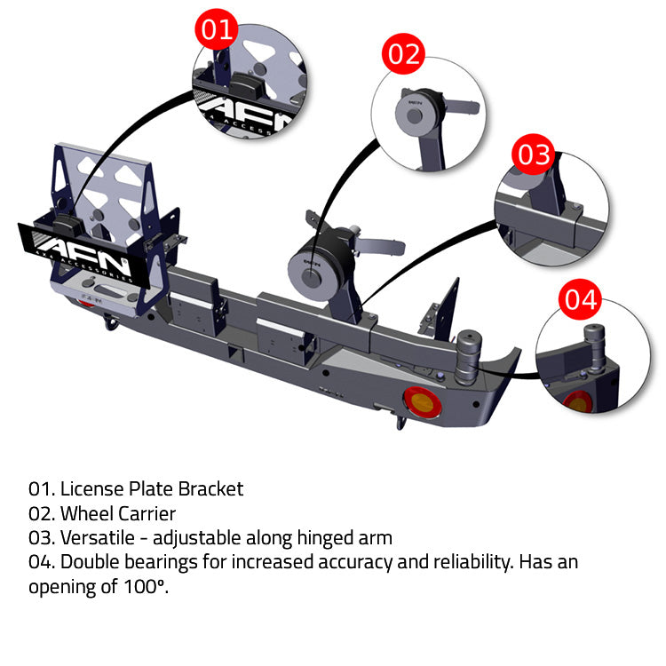 The Ford F250/F350 Super Duty Rear Bumper with Wheel Carrier and Jerry Can Bracket is ideal for expedition vehicles. Features reversible hinge swing-away, Spare Tire, and Jerry Can Rack.