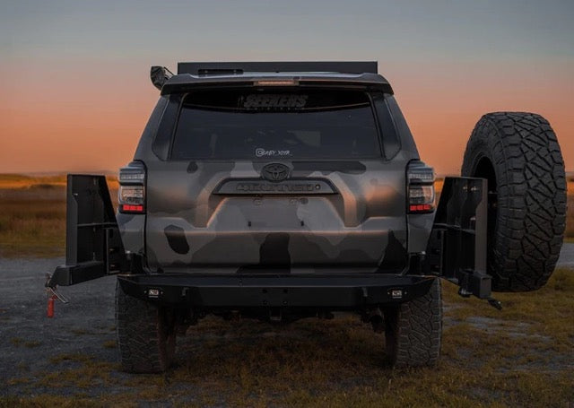 Overview: The Hi-Lite Overland Rear Bumper was built to perfectly fit 5th gen Toyota 4Runners. It features high ground clearance, one-piece steel design, lightweight aluminum dual swing-out doors, and steel mounting brackets and shackles mounts. This hybrid combination of steel and aluminum keeps the weight down, minimizes the risk of rust and corrosion, and offers all the strength and protection you’re looking for. This amazing bumper is also easily customizable, with options for adding a spare kit, auxiliary lighting, and more.