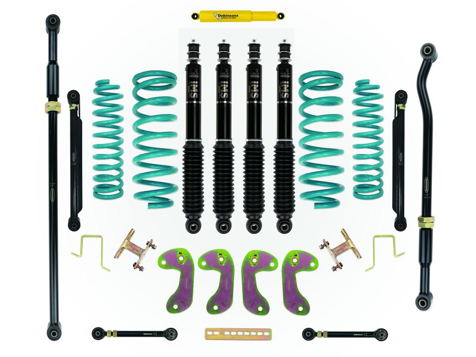 Kit includes front and rear shocks and coils, steering damper, 5 degree castor kit, Front and Rear adjustable panhard rods, front sway bar extensions and rear proportioning valve extension. NOTE: Rear sway bar extension brackets are recommended, but can't be included due to 2 different designs offered (sold separately), ask Dobinsons for help. Extended brake lines, bump stops, front drive shaft, and steering arms may be required, but are not offered by Dobinsons. This suspension is for off-road use only. Refer to local laws before purchasing or installation. Designed, developed and tested in Australia by Dobinsons Spring & Suspension, in-house suspension design engineers, Dobinsons 4×4 shock absorbers and coil springs are designed and tested to perform in the harshest conditions right across the world. We export to over 40 countries worldwide from our Australian head office, the importance of quality is at the forefront in the complete design and manufacturing process. This ensures every shock and coil spring can withstand the blistering heat and corrugations of the Australian outback right through to the subzero temperatures of a Russian winter. Our IMS shock absorbers are made from the world’s highest quality external and internal parts sourced worldwide. They provide a significant increase in performance over the standard shock absorbers. Our IMS shock absorbers feature larger bodies, larger bores and increased valving performance to dramatically improve vehicle handling and control and reduces shock fade.