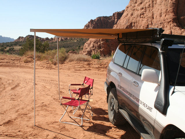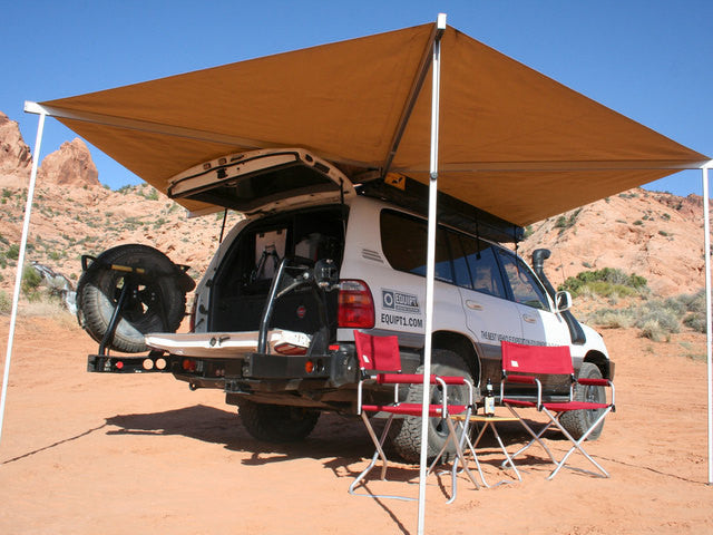 Introducing the Eezi-Awn Bat Awning. An innovative design awning can be deployed by one person in less than a minute, creating 270 degrees of free standing coverage around your vehicle from a 4" x 6" x 86”PVC case. When deployed, the awning stretches 80" to the side, 84" from the corner, and 80" to the back of the vehicle. The Bat Awning features a full aluminum frame construction with waterproof rip stop canvas panels, integrated height adjustable legs, and left side or right side applications. A perfect solution for camping, sporting events or family outings.