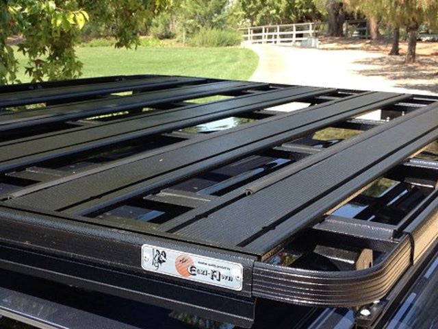 The Eezi-Awn K9 Roof Rack System for the Toyota 5th Generation 4Runner is 50" wide and is available in 3 different lengths. The 1.6M model is a 3/4 length rack measuring 62" long. It incorporates a rail and foot component set. Utilizing the Toyota OEM mounting locations for the factory rack, Eezi-Awn has a proprietary rail that is drilled specifically for the 5th Generation 4Runner roof and accepts a set of height and angle adjustable feet. The platform is then mounted to these feet to complete the system.