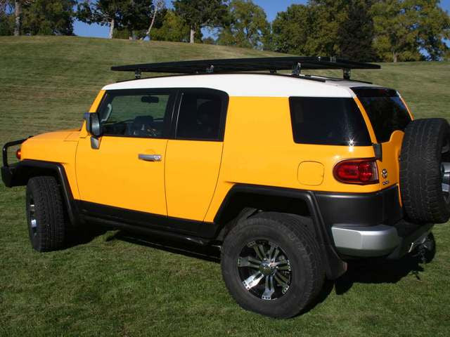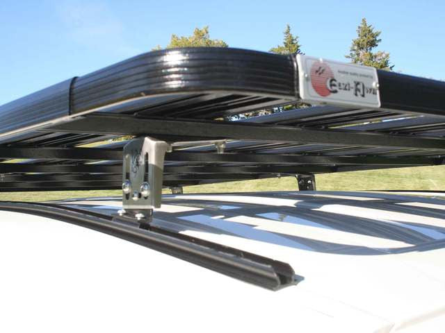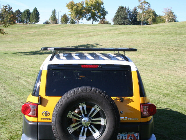 The Eezi-Awn K9 Roof Rack System for the Toyota FJ Cruiser shares the same platform size as the 2 meter rack system for the 100 Series and 200 Series Land Cruisers. It incorporates a rail and foot component set. Utilizing the Toyota OEM mounting locations for the factory rack, Eezi-Awn has a proprietary rail that is drilled specifically for the FJ Cruiser roof and accepts a set of height and angle adjustable feet. The platform is then mounted to these feet to complete the system.