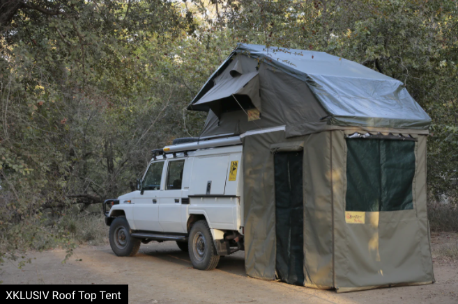 The XKLUSIV Roof Top Tent from Eezi-Awn utilizes the same folding platform design and main features as the Series 3 Roof Top Tent, Eezi-Awn's flagship RTT model, but also offers an extended roof line and ground-level room (with a 6'5" ceiling height) for added comfort. It can be mounted for entry facing the back or either side of most vehicles or trailers. This series offers a range of sizes to accommodate as little as 2 adults up to a family of 5.
