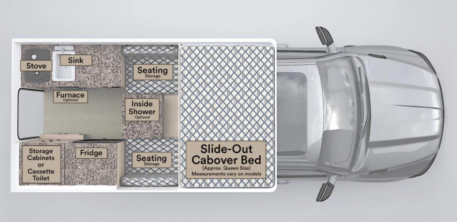 Overview: Check out this stock unit GRANDBY slide-in pop up Camper with Front Dinette floor plan by Four Wheel Campers that will be ready for installation at any three of our locations. The GRANDBY model camper is made to fit most full-size trucks with an 8' bed length.