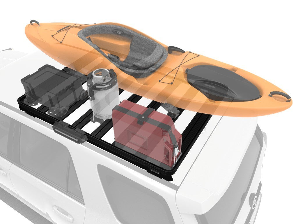 This 1560mm/61.4" long 3/4 size Slimline II cargo roof rack kit contains the Slimline II Tray, Wind Deflector and 2 Foot Rails to mount the Slimline II Tray to your Toyota 4Runner (5th Gen). It easily installs using the existing factory mounting points. No drilling required.