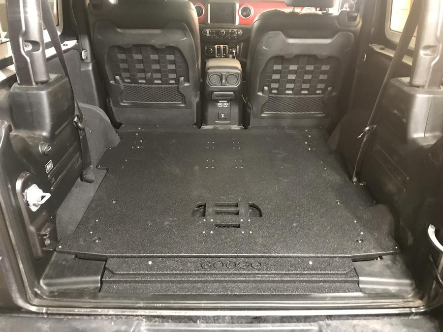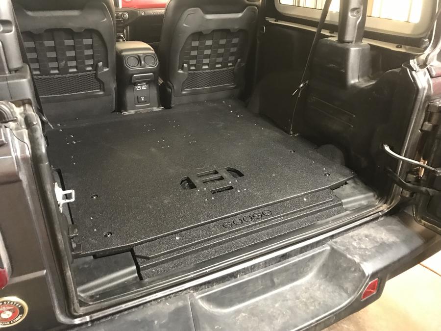 The Jeep Plate System features a Bullet Liner covered Baltic Birch plywood. This plate allows the user to easily install various Jeep Specific modules including single and double drawer systems as well as the ever famous Icebox module and the CampKitchen. The plate system also makes a great platform for securing your own storage or gear including dog crates, other fridge slide brands, etc. Due to the extra depth of the 2 door plate you can use the deeper modules such as the 36" deep Single Drawer Modules and the 28" deep Double Drawer Modules. You can also use the standard IceBox and CampKitchen units including the CampKitchen 2.2 for the National Luna Weekender 50/52.