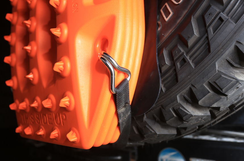 Overview: Black Nylon and stainless steel quick-release harness for securely mounting your MAXTRAX on a rear-mounted spare wheel.