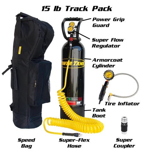 This Track Pack system includes everything you need to run air tools with our advanced universal safety Super Coupler and air up tires through a dedicated HD Tire Inflator with Gauge. It also includes a Speed Bag for easy transport of your Power Tank, hose, and accessories.