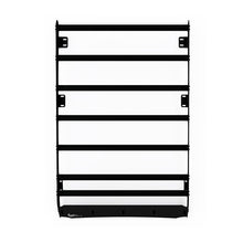 Product powder coated in a satin black texture with black anodized aluminum cross-bar extrusions. One crossbar will not be anodized. It is intended to sit behind the wind deflector.