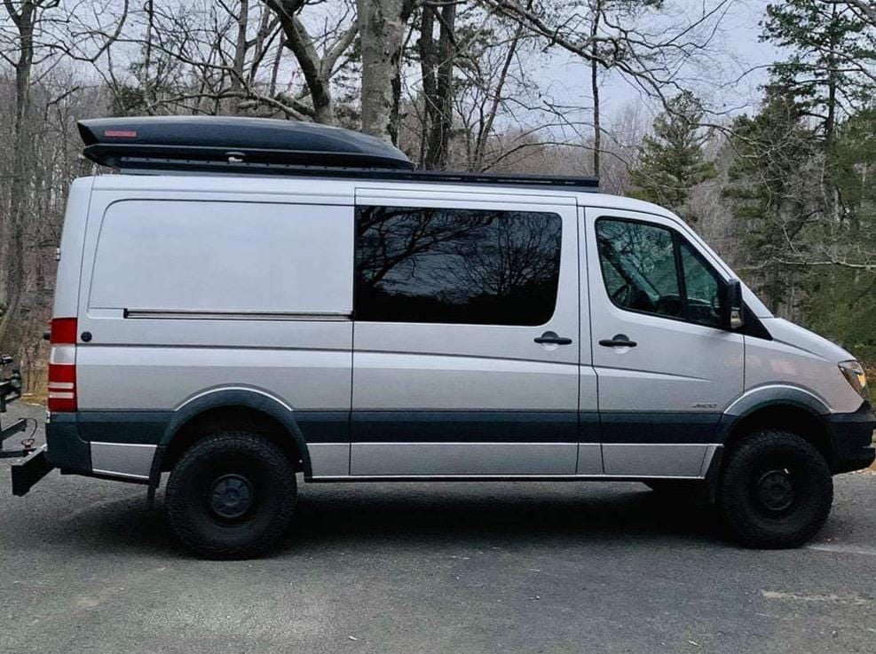 The Low Pro looks great with or without all the extras, and it easily slides into the stock roof rails. This adds a great look to your low roof Sprinter van and gets the job done. Aluminum Extrusion crossbars give an endless amount of options for mounting solar, gear, and decking.